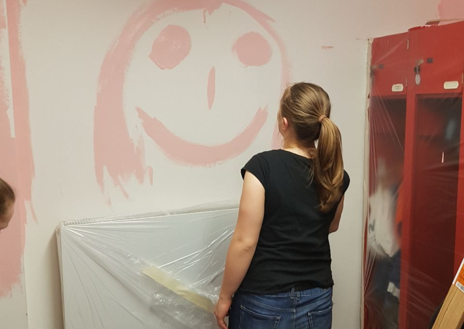 Danach ging es an das Ausräumen des Jugendraumes. Böden wurden abgedeckt, Pinsel in die Hand gedrückt und los ging es. Zuerst wurden die Wände gespachtelt und geschliffen und anschließend im Jugendraum weiß gestrichen. Danach entschieden sich die Jugendlichen für eine farbliche Untermalung in ihren Umkleideräumen. Die Mädchen tendierten zu rosa, die Jungen zu blau. Gesagt getan. Zum Schluss wurde die große Wand im Jugendraum für ein Farbdesign vorbereitet.