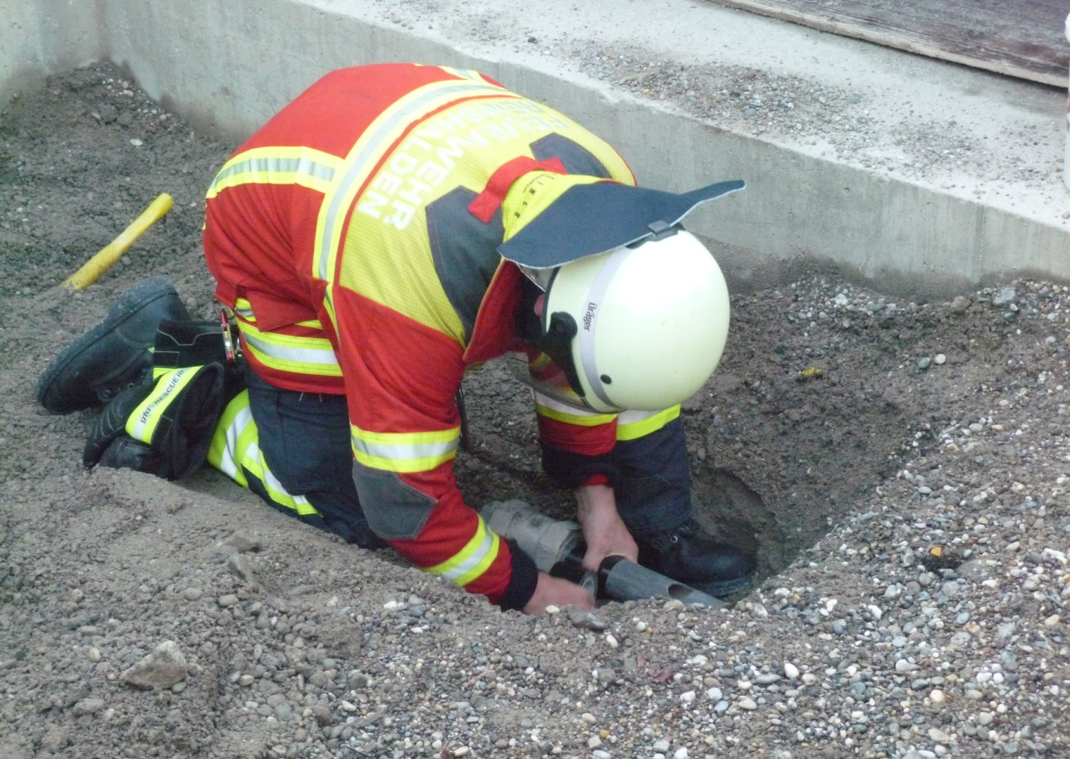 Ein Referent von der Netze BW, dem Betreiber der Gasleitung, erklärte zunächst in einem Theorieblock den Aufbau des Leitungsnetzes, das Drucksystem, sowie Abstellmöglichkeiten bei einem Störfall. Bevor es anschließend an die Praxis ging. An einer landesweit einzigartigen Demonstrationsanlage auf dem Gelände des Ausbildungszentrums Bau in Geradstetten konnten die Feuerwehrangehörigen hautnah erleben, was passiert wenn Erdgas aus einer beschädigten Leitung austritt. Aber nicht nur die Kräfte und die gewaltige Geräuschentwicklung die sich bei einer unkontrollierten Ausströmung entwickeln beeindruckten. Sondern auch die Stichflamme die durch Zuführung einer Zündquelle entsteht. Dabei reicht oftmals ein elektrischer Funke. Nach den verschiedenen Vorführungen durften die Übungsteilnehmer selbst ran. Mit Hilfe von mitgeführten Gerätschaften auf dem Einsatzfahrzeug musste weiteres Ausströmen verhindert werden. So drückten sie zum Beispiel mit dem Spreizer die Gasleitung ab.