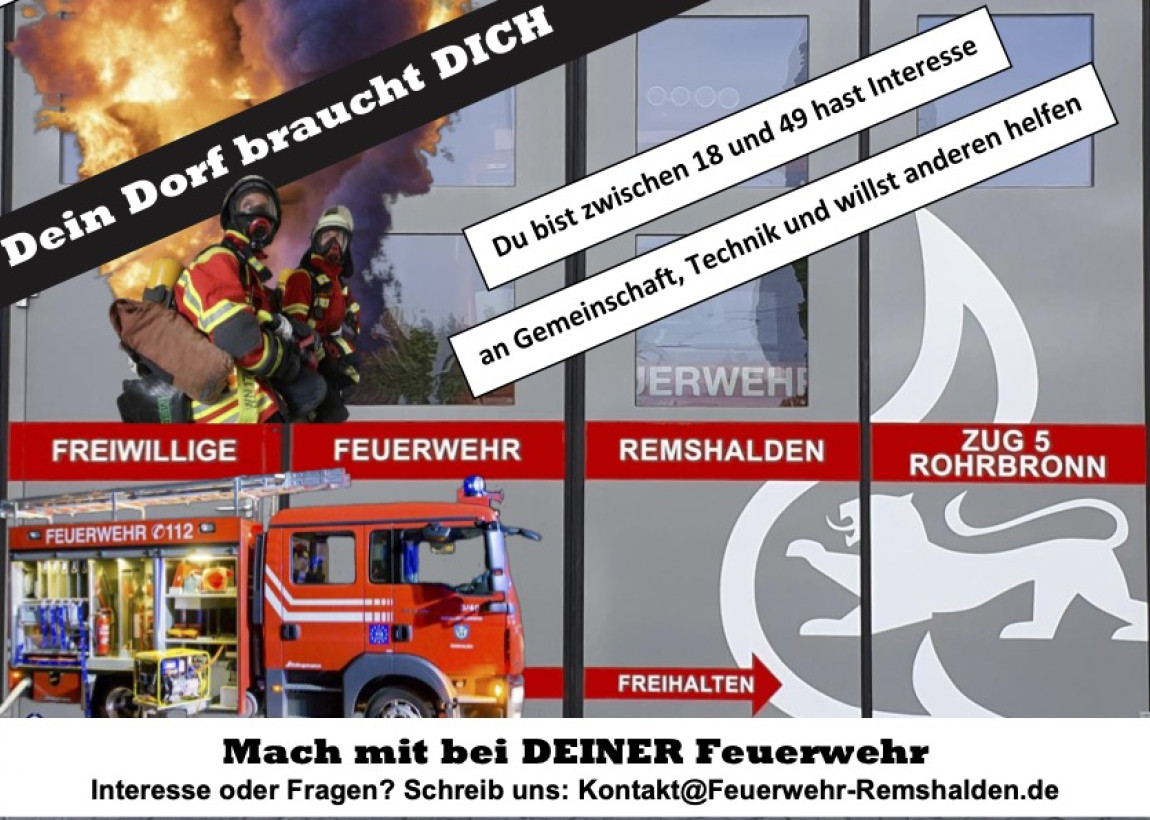 Aktuell benötigt der Zug 5 der Feuerwehr Remshalden dringend Verstärkung. Gesucht werden Frauen und Männer aus Rohrbronn zwischen 18 und 49 Jahren, für die das Retten von Personen, das Löschen von Bränden und der Schutz der Umwelt vor Gefahren Ehrensache ist. Lassen sie uns diese Aufgaben gemeinsam mit Teamarbeit und moderner Technik bewältigen. Denn ihr Dorf braucht Sie.