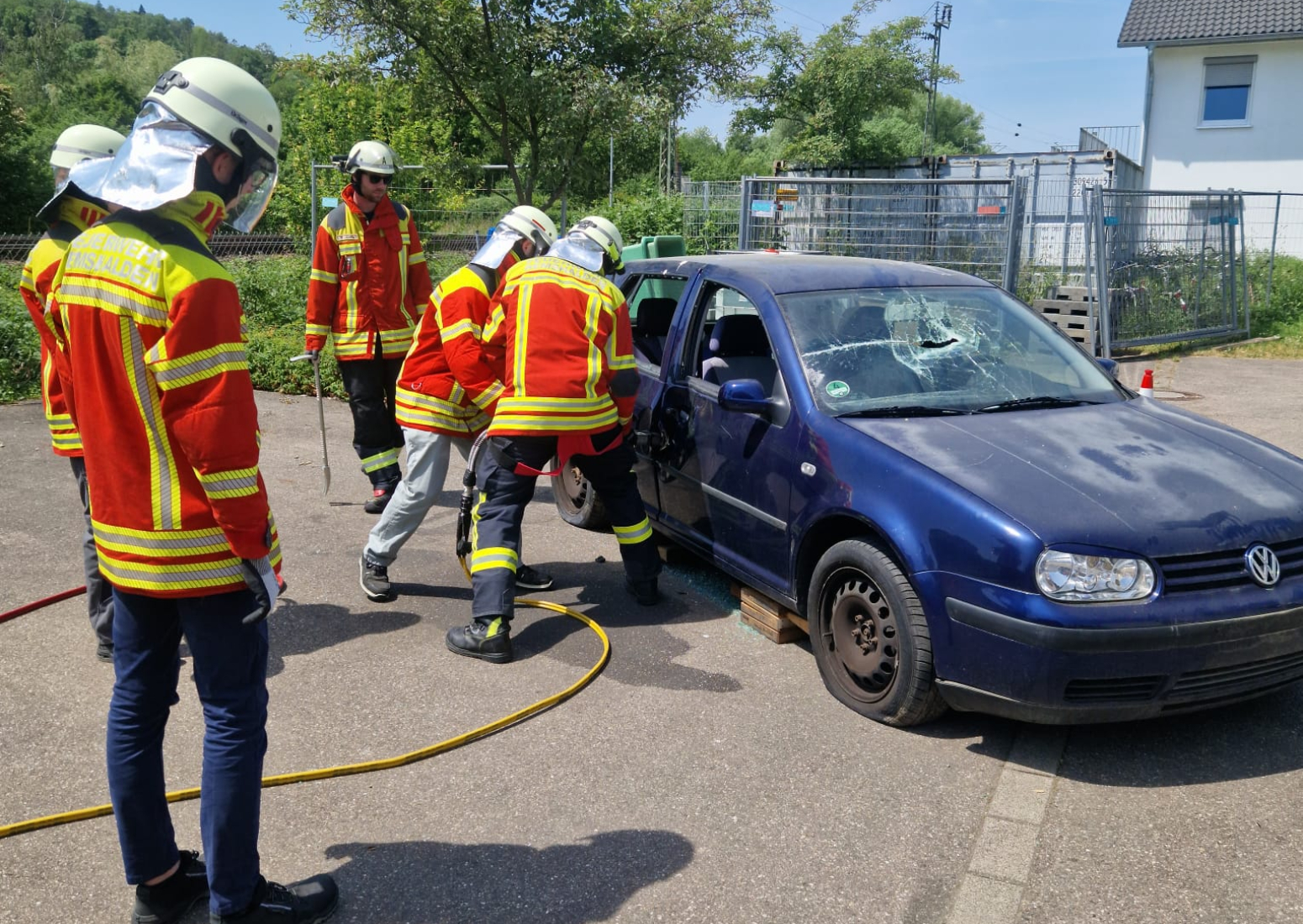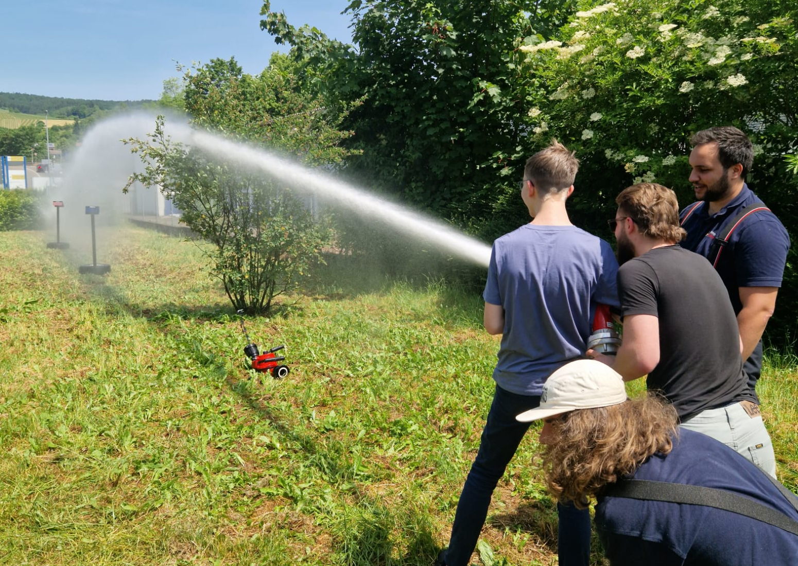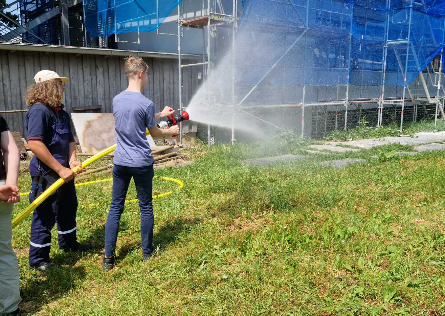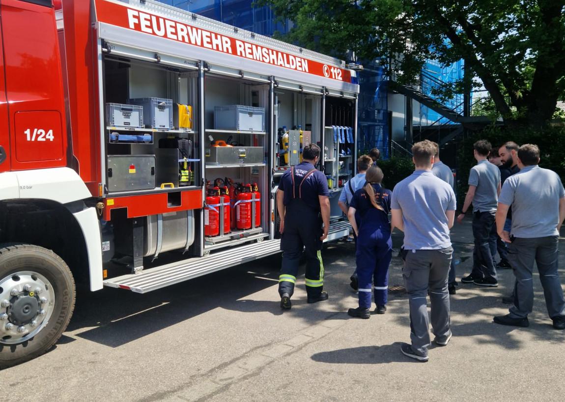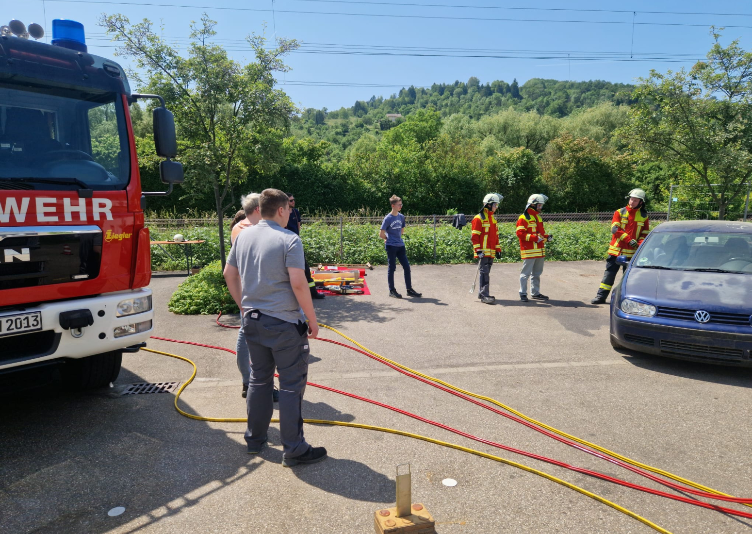 Am Tag darauf fand der Gegenbesuch der Auszubildenden von Schnaithmann bei uns in der Feuerwache statt, der ebenfalls zunächst mit einer Führung über das Gelände begann. Danach trafen wir uns alle hinter dem Feuerwehrhaus für ein gemeinsames Mittagessen, das die Jugendfeuerwehr gegrillt hatte. Per Auslosungsverfahren wurden alle Teilnehmer anschließend in drei Gruppen auf die Stationen aufgeteilt, um sich am Feuerlöscher zu versuchen, mit verschiedenen Strahlrohren zu experimentieren und ein Auto zu zerschneiden.
