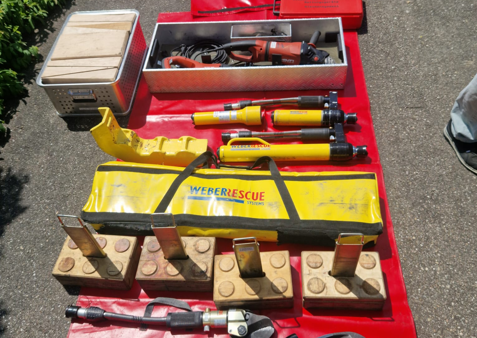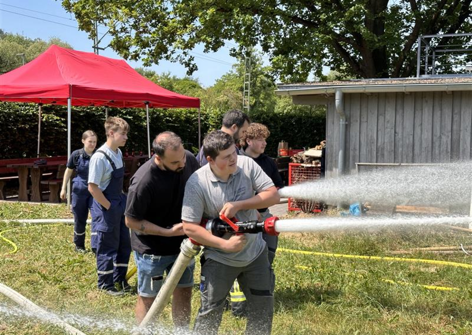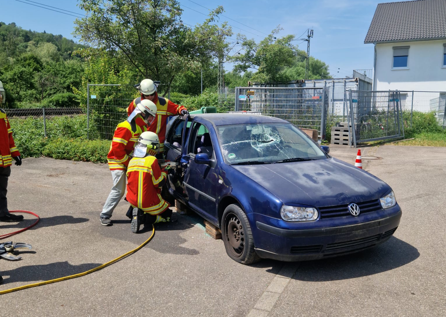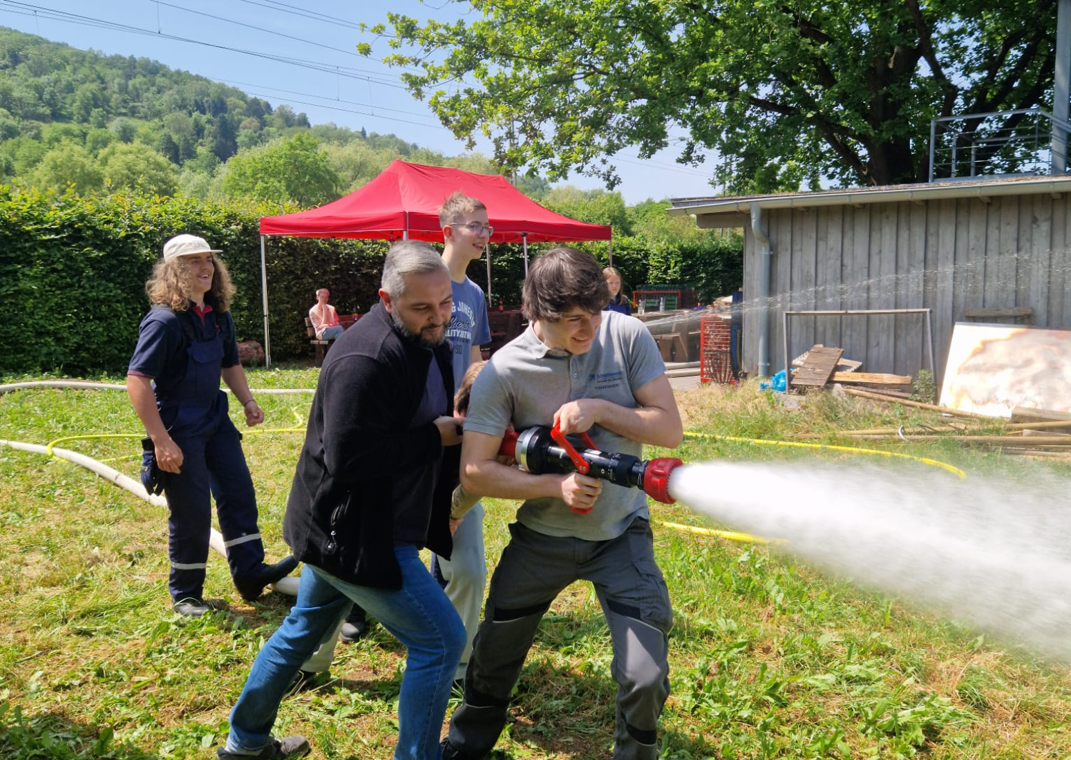 Am Tag darauf fand der Gegenbesuch der Auszubildenden von Schnaithmann bei uns in der Feuerwache statt, der ebenfalls zunächst mit einer Führung über das Gelände begann. Danach trafen wir uns alle hinter dem Feuerwehrhaus für ein gemeinsames Mittagessen, das die Jugendfeuerwehr gegrillt hatte. Per Auslosungsverfahren wurden alle Teilnehmer anschließend in drei Gruppen auf die Stationen aufgeteilt, um sich am Feuerlöscher zu versuchen, mit verschiedenen Strahlrohren zu experimentieren und ein Auto zu zerschneiden.