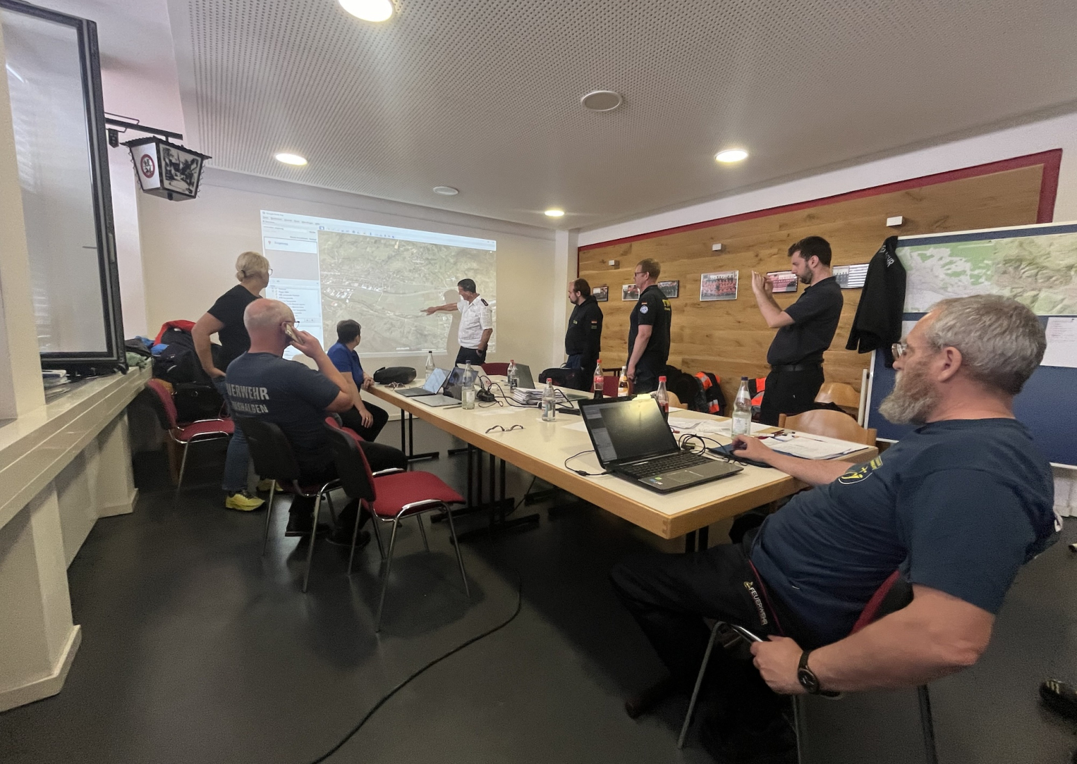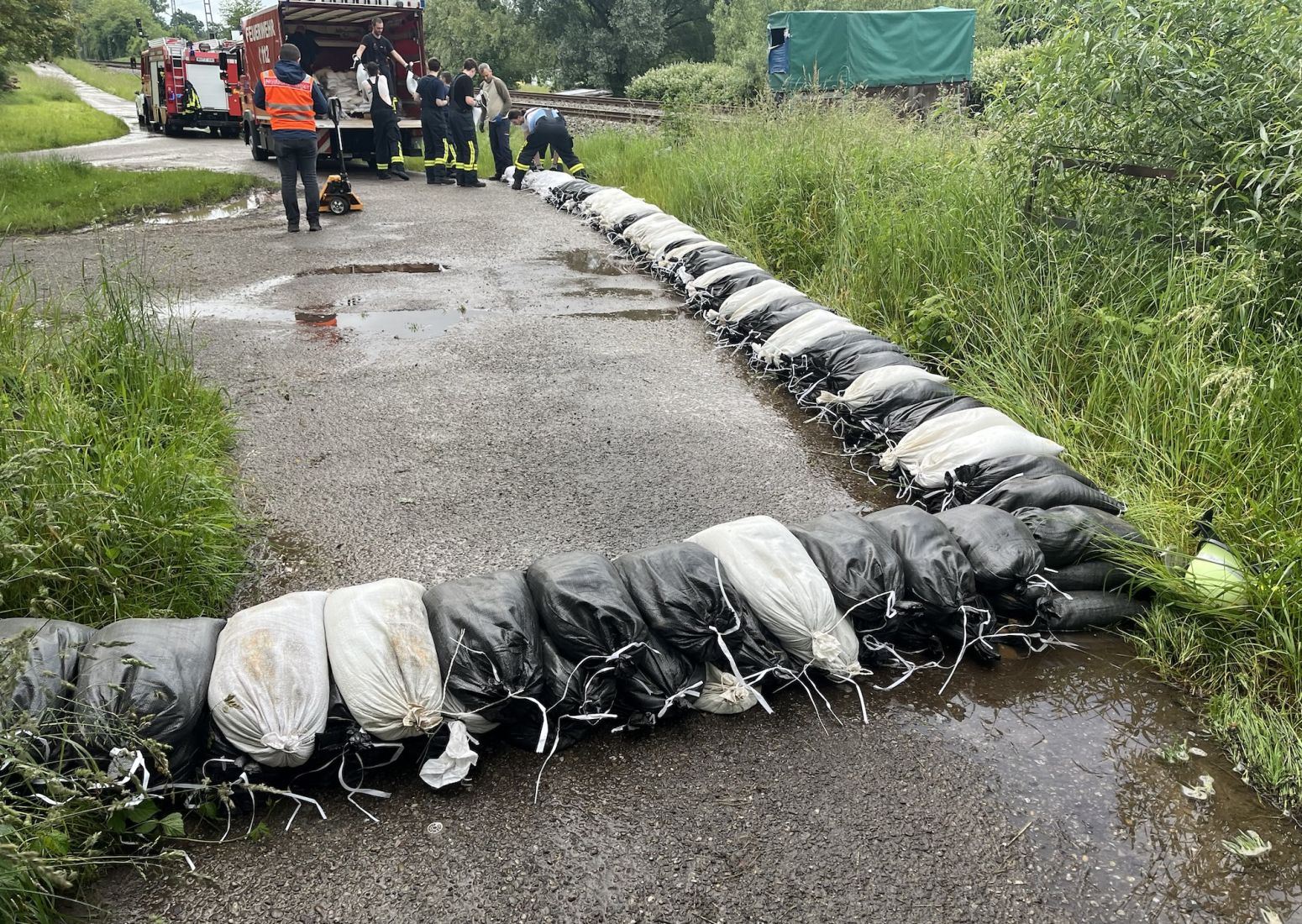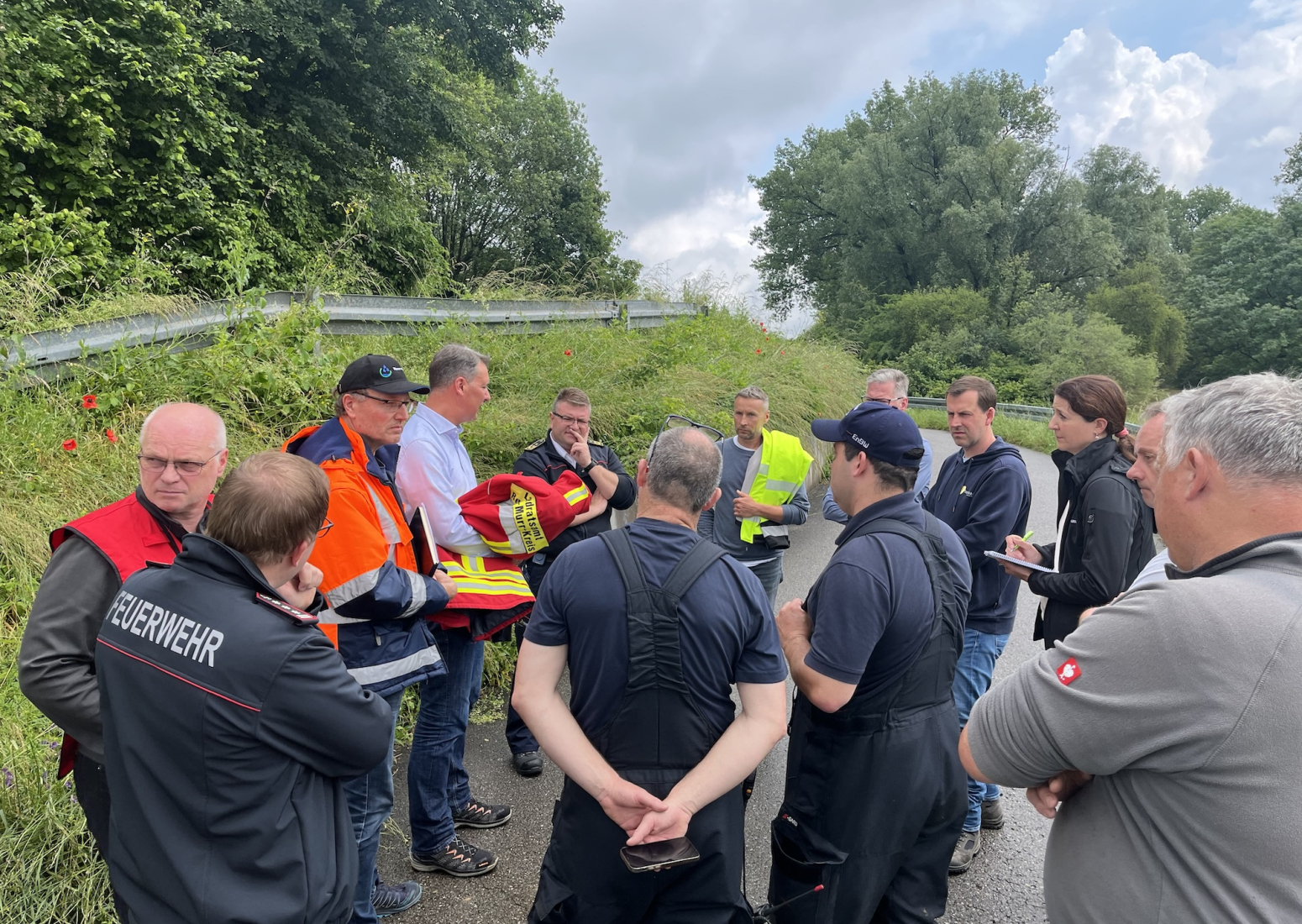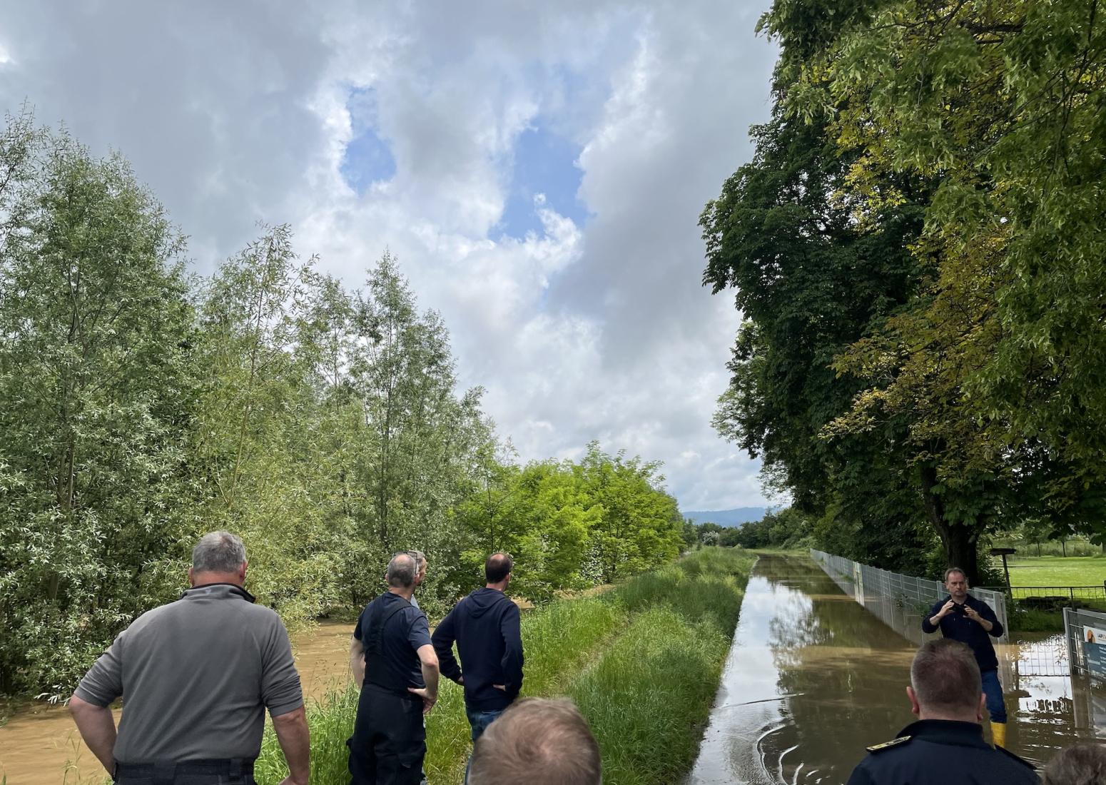 Doch die Ruhe dauerte nicht lange. Noch vor 8 Uhr alarmierte die Integrierte Leitstelle die Einsatzkräfte zu einem überfluteten Keller. Im weiteren Verlauf des Tages trafen sich der Landrat und Vertreter aus den Kommunen aus dem unteren Remstal am Regenrückhaltebecken Winterbach. Auf Grund des weiterhin vorhergesagten Dauerregens entschieden die Verantwortlichen das Rückhaltebecken schnellstmöglich zu leeren, um für weitere Ereignis gerüstet zu sein. Der Kreis rief daraufhin die „außergewöhnliche Einsatzlage“ aus. Die Krisenstäbe trafen sich wieder. In enger Abstimmung zwischen den Gemeinden Winterbach und Remshalden fand der Aufbau von Sandsackbarrieren an der Grenze zu den geplanten Überflutungsflächen statt. Warnapps informierten die Bevölkerung über das Vorgehen. Nachdem die Vorbereitungen abgeschlossen und die Beobachtungspunkte eingerichtet waren, startete das kontrollierte Ablassen. Auch durch eine Drohne des Technischen Hilfswerkes hatte der Stab jederzeit Blick auf das aktuelle Geschehen und konnte bei Lageveränderung jederzeit eingreifen. Gegen 20 Uhr waren die Maßnahmen erfolgreich beendet.