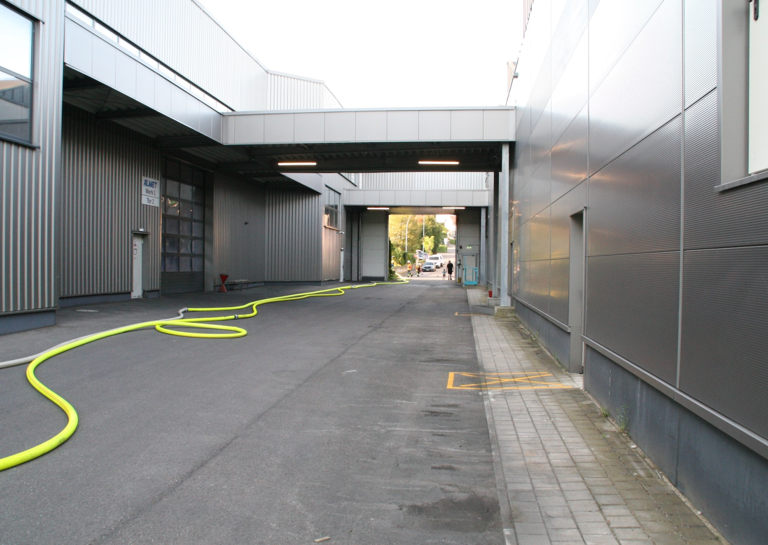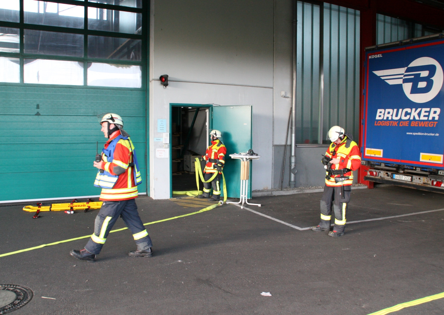 Im Übungsverlauf haben weitere Rauchmelder in der anschließenden Halle ausgelöst. Ursache hierfür war ein LKW Brand. Weitere Fahrzeuge rückten zur Unterstützung an, welche von der Gebäuderückseite den Brand bekämpften. Im Vordergrund steht dabei aber immer die Menschenrettung. Deshalb suchten mehrere Trupps unter Atemschutz die Halle nach vermissten Personen ab. Zur Sicherstellung der Wasserversorgung wurden mehrere hunderte Meter Schlauchleitung verlegt.