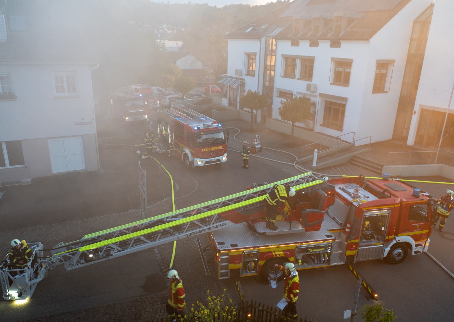 Am Montag, den 20. April 2026, führte der Zug 2 der Feuerwehr Remshalden gemeinsam mit der Feuerwehr Weinstadt eine Einsatzübung mit dem Szenario „Wohnungsbrand im 1. Obergeschoss“ durch.