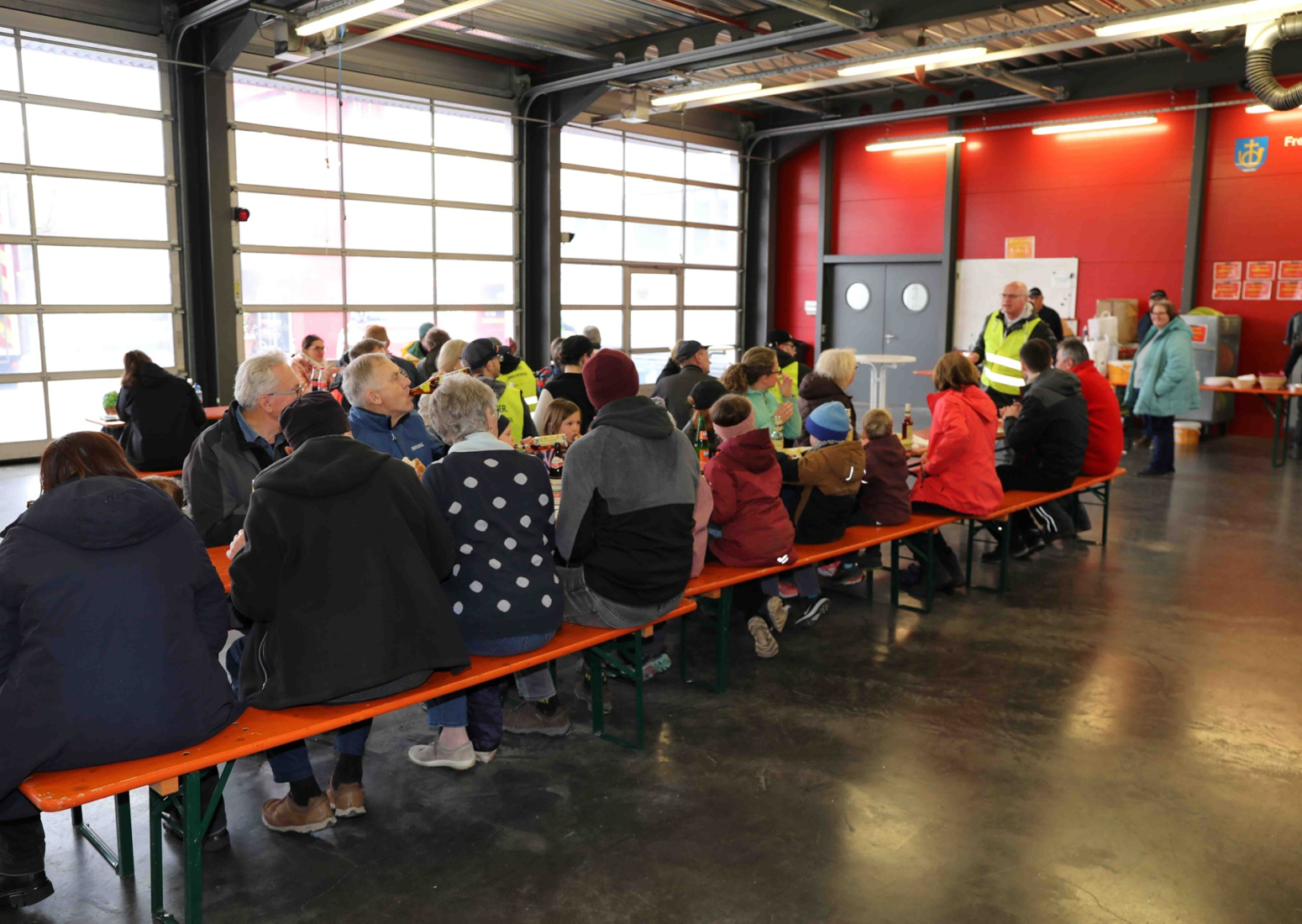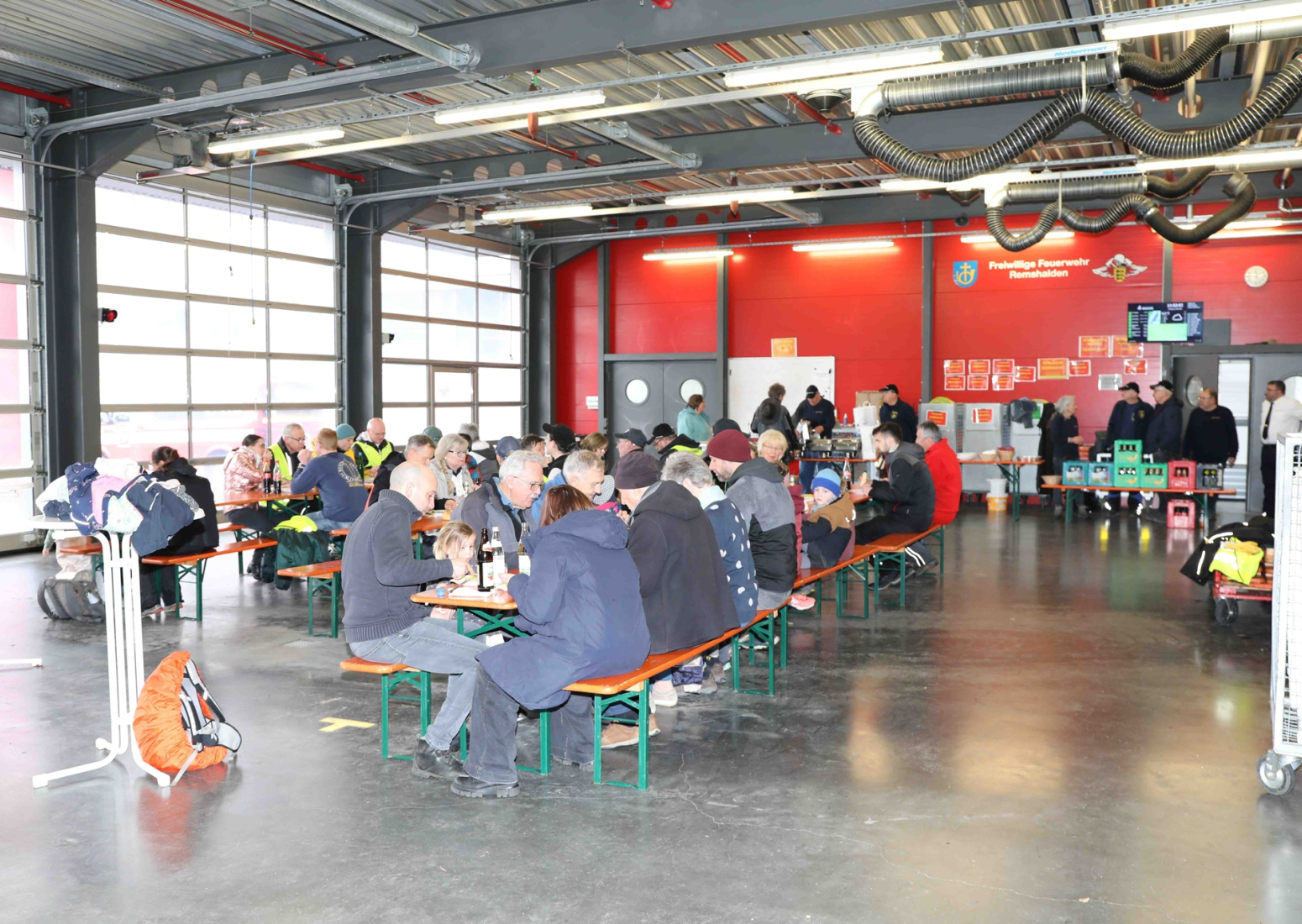 Auch die Verpflegung der hungrigen Müll-Sammler und Sammlerinnen übernahm die Altersabteilung. Bei Maultaschen mit Kartoffelsalat und Saiten sowie einem Getränk wurden die Lebensgeister nach der Sammelaktion im Regen wieder zum Leben erweckt. Die Kinder hatten ihren Spaß im Feuerwehrhaus mit den großen Fahrzeugen.