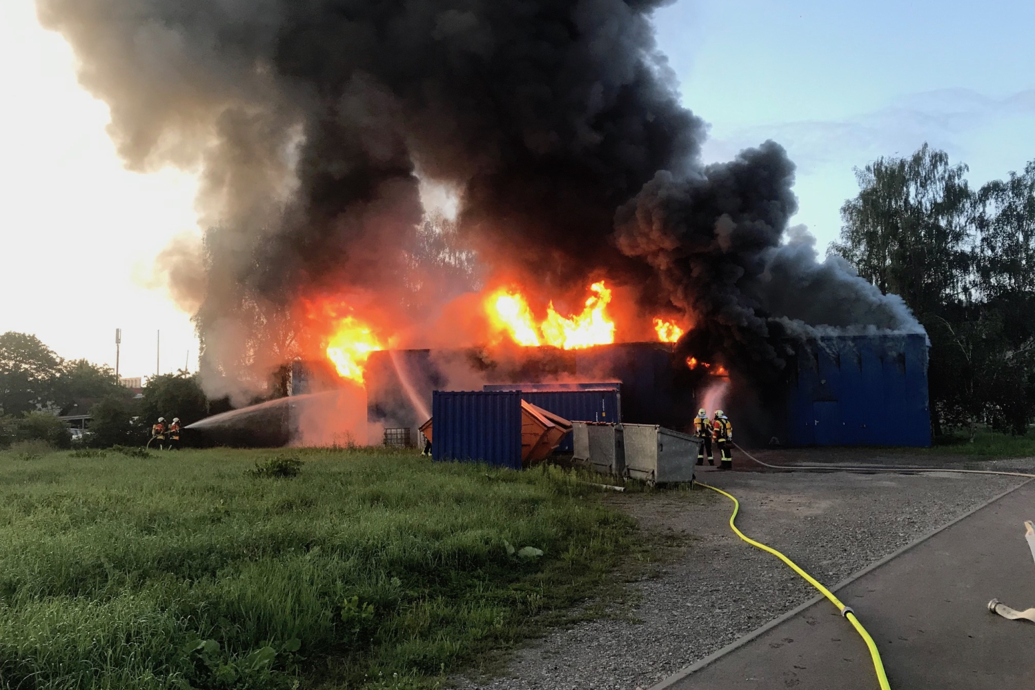 Am frühen Freitagmorgen alarmierte die Integrierte Leitstelle des Rems Murr Kreises die Freiwillige Feuerwehr Remshalden zu einem Gebäudebrand nach Grunbach. Schon während der Anfahrt war eine starke Rauchentwicklung zu erkennen. Deshalb forderte der Einsatzleiter umgehend Verstärkung aus den Teilorten Buoch und Rohrbronn nach. Beim Eintreffen der ersten Kräfte stand ein Firmengebäude in Vollbrand. Umgehend wurden mehrere Löschrohre zur Bekämpfung des Brandes eingesetzt. Darunter auch ein Rohr von der automatisch mitalarmierten Drehleiter aus Weinstadt. Damit bei dem langen Verlauf des Geschehens genügend Atemschutzflaschen zur Verfügung standen, kam der GW-Atemschutz aus Fellbach zum Einsatz. Zudem führte die Feuerwehr Backnang mit einem Erkundungsfahrzeug Messungen der Umgebungsluft durch, diese haben keine Auffälligkeiten ergeben. Ebenfalls war der Rettungsdienst mit einer Großzahl von Einsatzkräften vor Ort.