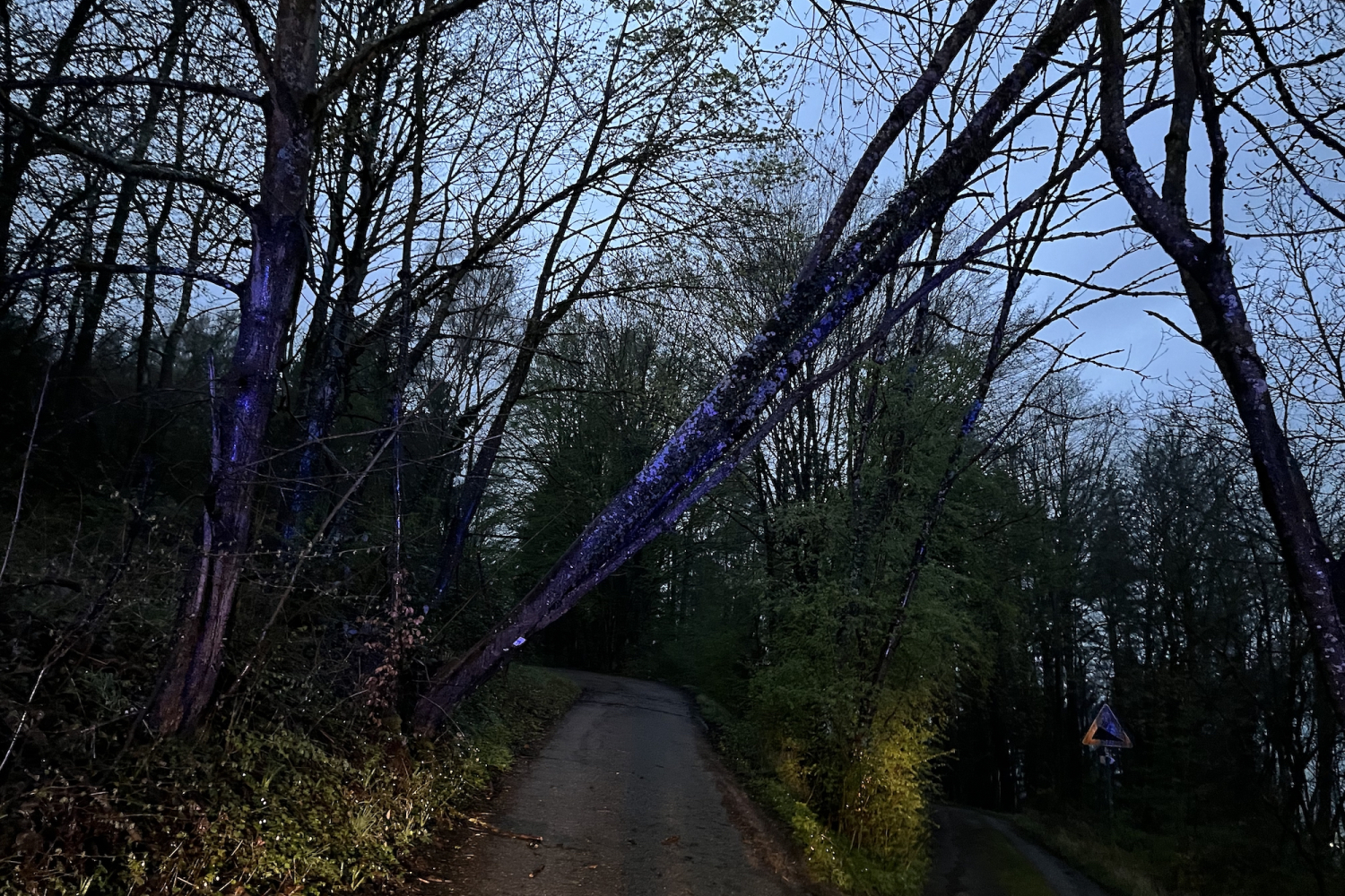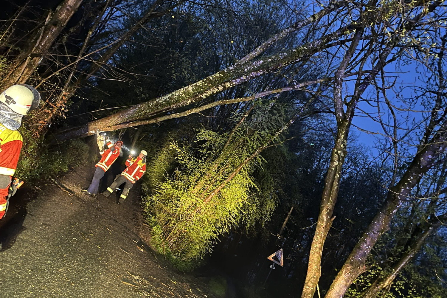 Dieser hängte quer über der Fahrbahn in einem anderen Baum und drohte auf eine Telefonleitung zu stürzen.