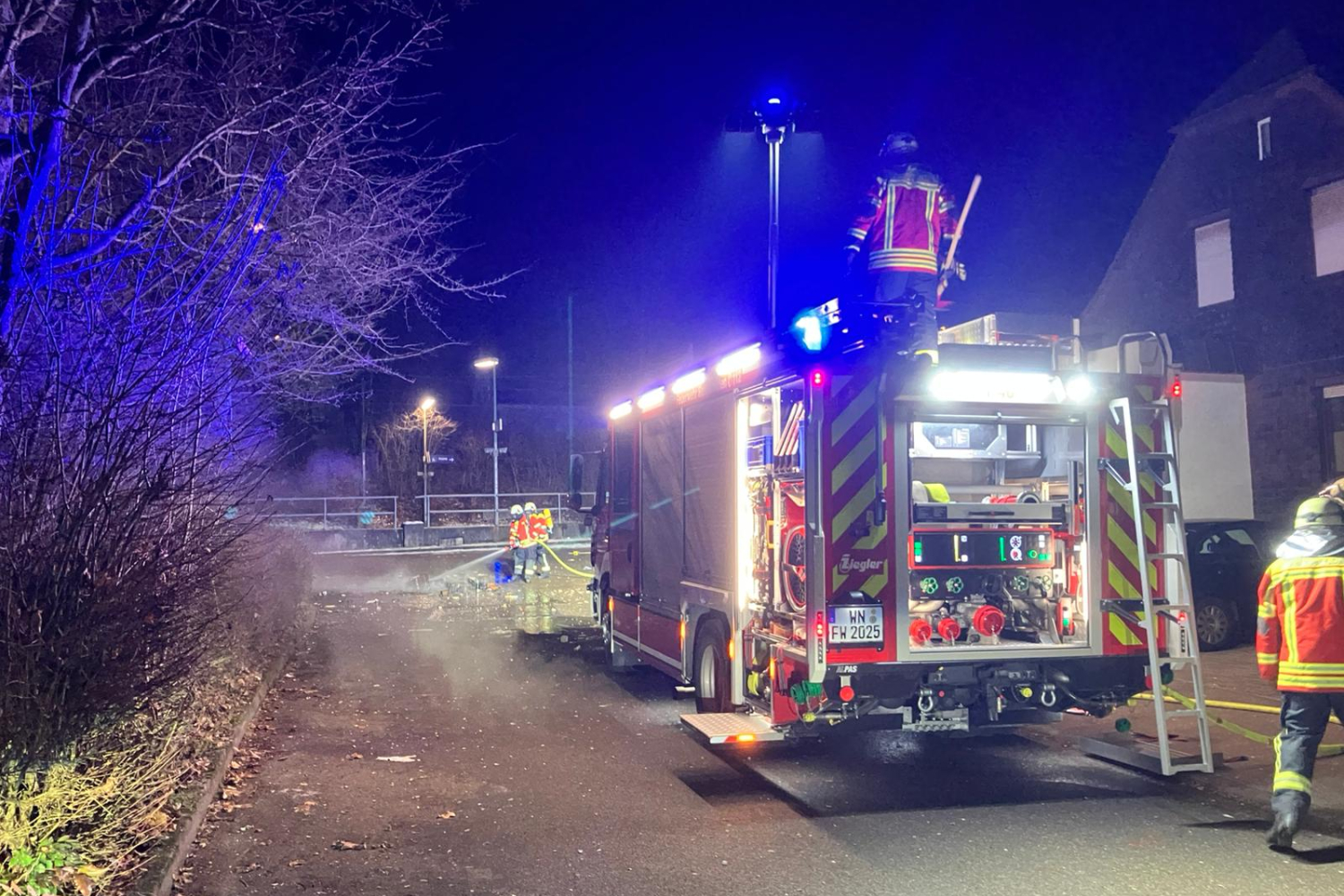 In der Silvesternacht wurde die Freiwillige Feuerwehr Remshalden zu einem Fahrzeugbrand alarmiert. Vor Ort wurden jedoch brennende Feuerwerksbatterien festgestellt, die auf einem Haufen lagen. Diese wurden mit einem C-Rohr abgelöscht.